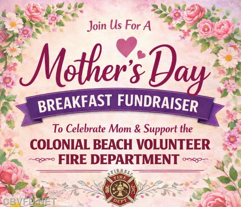 | Colonial Beach VFD will be hosting a Mother's Day Buffet Breakfast on Sunday May 10, 2026 from 7 AM to 10 AM. Menu includes Sausage, Pancakes, Bacon, and More. $15 per person all you can eat and under 4 Years old are Free. All proceeds benefit the Colonial Beach VFD. |